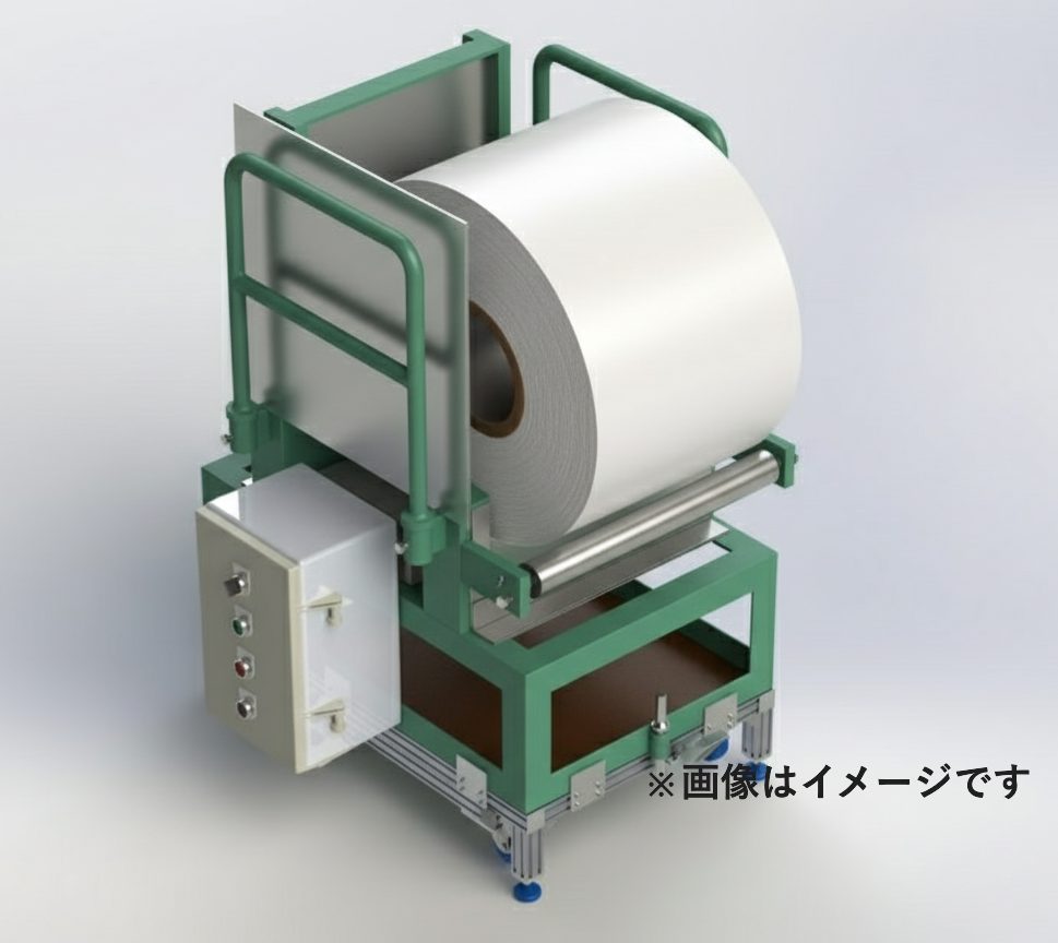 この台車は、重量ロール紙を扱うために構造を強化しています。また、巻出機の軸にロール紙を正確にセットできるよう、最大20〜30㎜のワンピッチワンストロークによる精密な位置決め機能を搭載しており、作業の効率化と安全性の向上に貢献しています。さらに、傾斜のある場所やリフトアップ作業中においても、台車が不意に動くのを防ぐための強固な固定機能が設けられており、安定した運搬作業を実現します。
