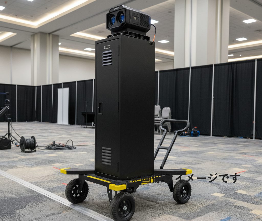 イベント会場の運営会社様より、機材運搬用の台車についてご相談をいただきました。特に問題となっていたのは、高さ約2m、重量60kgのプロジェクター台の運搬でした。