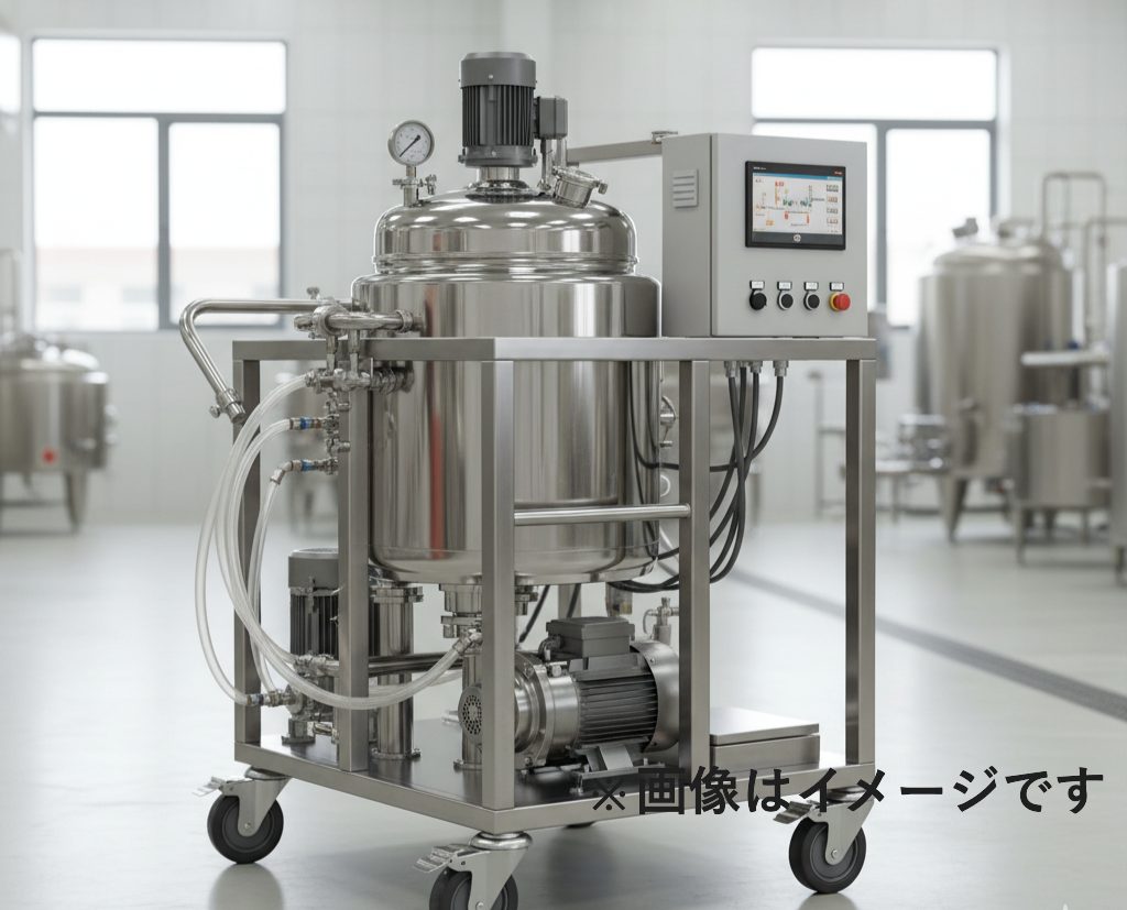 こちらは、食品メーカー様の製造設備と制御機器、ポンプなどの付帯設備をまとめて載せることができる台車です。200L以上のステンレスジャケット容器に加え、複数の製造設備を設置しております。
