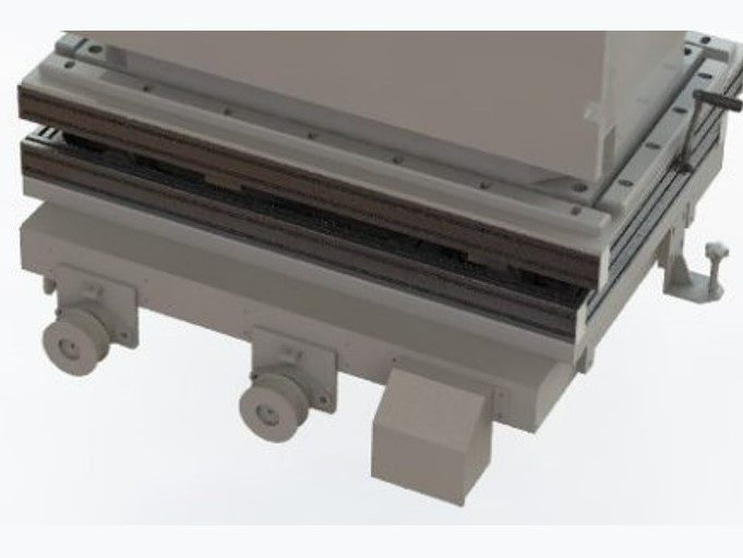 工場で使用される金型交換用台車です。お客様からレールの上で金型を走らせた後、金型を40mm上昇させたいという要望を受けて、特注台車を設計・製作いたしました。