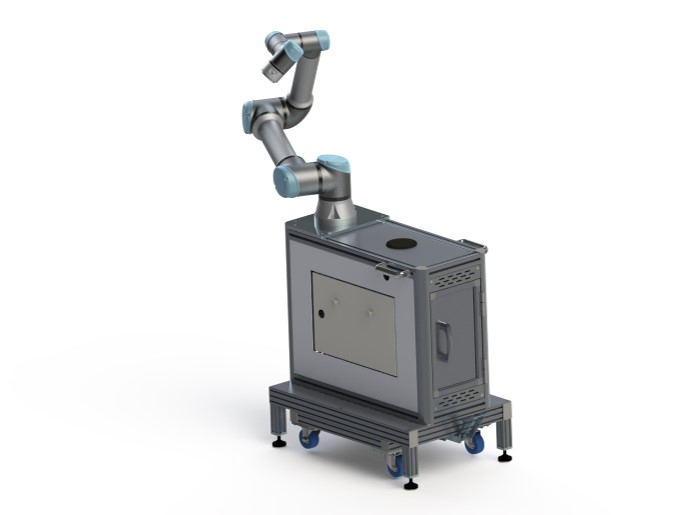 お客様から、3kg可搬と5kg可搬の協働ロボットを搭載する台車の設計依頼がありました。架台は小型のものを希望されており、他社メーカーでも同じ形状のものはあるものの、運搬時に「うんぱんマン」を使用できることにメリットを感じて、特注台車をご依頼いただきました。